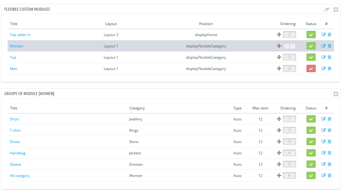 This module allows to create list of category (in our demo we create three categories: Women, Top, Top seller in), and create a list of group inside each category, each group has a list of product which is chosen from a default category or from individual category which is described as the image below: